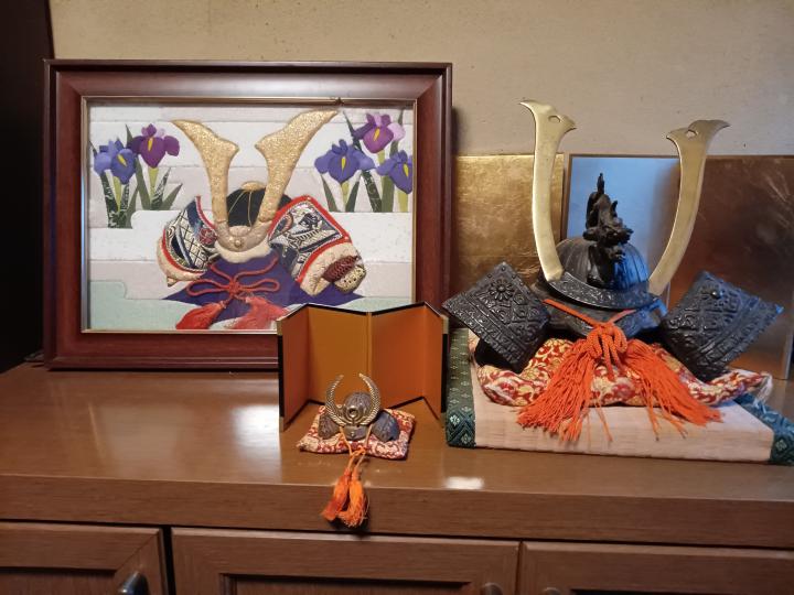 5月の玄関は子供の日をメーンに古い兜と木目込みの兜を飾りました。遠く離れた孫たちの成長と幸福を願う気持ちを込めて、また兜は守りの象徴でもあります。来訪者とひと時孫の話になり幸せを感じます。